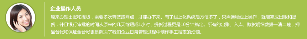 同時,企業(yè)人員可通過系統(tǒng)實時查詢業(yè)務(wù)辦理進(jìn)展,方便安排生產(chǎn)經(jīng)營。線上化系統(tǒng)減少了資料傳遞的過程,省去了到營業(yè)網(wǎng)點轉(zhuǎn)保證金等步驟,整個出賬過程方便快捷。